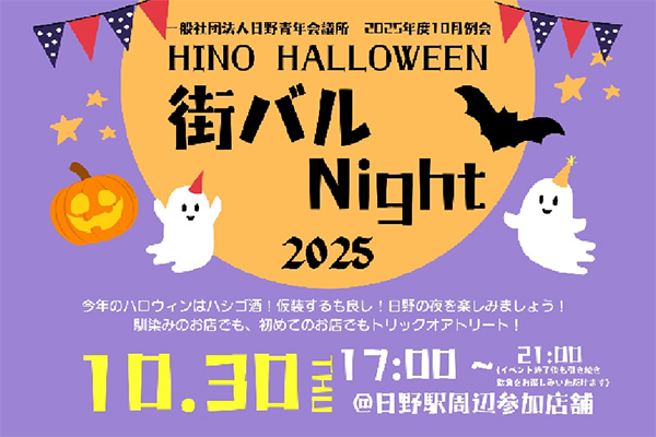 今年のハロウィンはハシゴ酒!仮装するも良し!日野の夜を楽しみましょう!馴染みのお店でも、初めてのお店でもトリックオアトリート!日野駅前15店舗で特別メニューを…