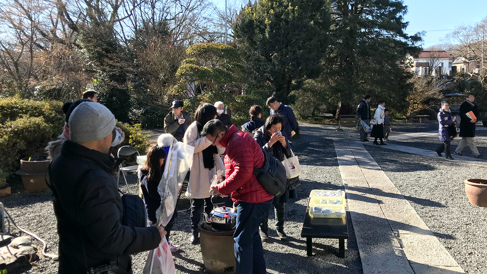 五日市地区の五日市ひろばには休憩所を設け、お茶や味噌汁のふるまいも。夢見札や日めくりカレンダーなども販売されます。